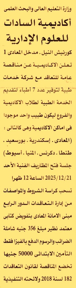 HOT Information مناقصة عامة لعملية التعاقد على توفير عدد 7 أطباء لتقديم الخدمة الطبية لطلاب الأكاديمية والفروع ليكون طبيب واحد موجود في أماكن الأكاديمية وهي كالتالي “المعادي, الإسكندرية, بورسعيد, طنطا, دكرنس, المنيا, أسيوط” عن جريدة الأهرام Post navigation شركة مياه الشرب والصرف الصحي بالبحيرة الهيئة العامة للتأمين الصحي فرع بني سويف