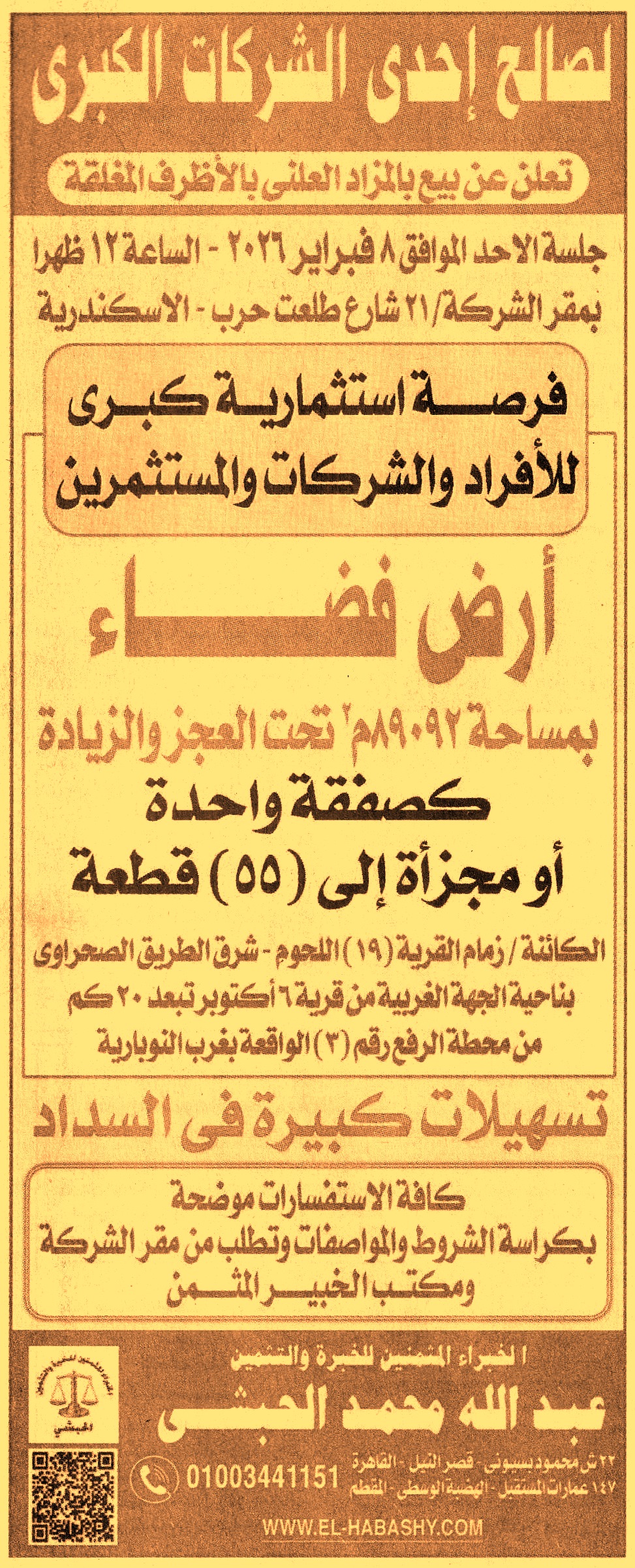 بيع قطعة أرض فضاء بمساحة 89092م2 تحت العجز والزيادة