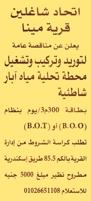 HOT Information مناقصة عامة لعملية توريد وتركيب وتشغيل محطة تحلية مياه أبار شاطئية بطاقة 300م3/يوم بنظام B.O.O أو B.O.T عن جريدة الأهرام Post navigation مركز البحوث النووية الجامعة المصرية اليابانية للعلوم والتكنولوجيا ببرج العرب