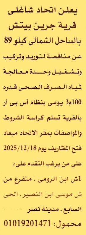 HOT information مناقصة عامة لعملية توريد وتركيب وتشغيل وحدة معالجة لمياه الصرف الصحي قدرة 100م3 يومي بنظام أس بي أر بالقرية عن جريدة الأهرام Post navigation مستشفى بدر الجامعي الشركة المصرية لتجارة الجملة