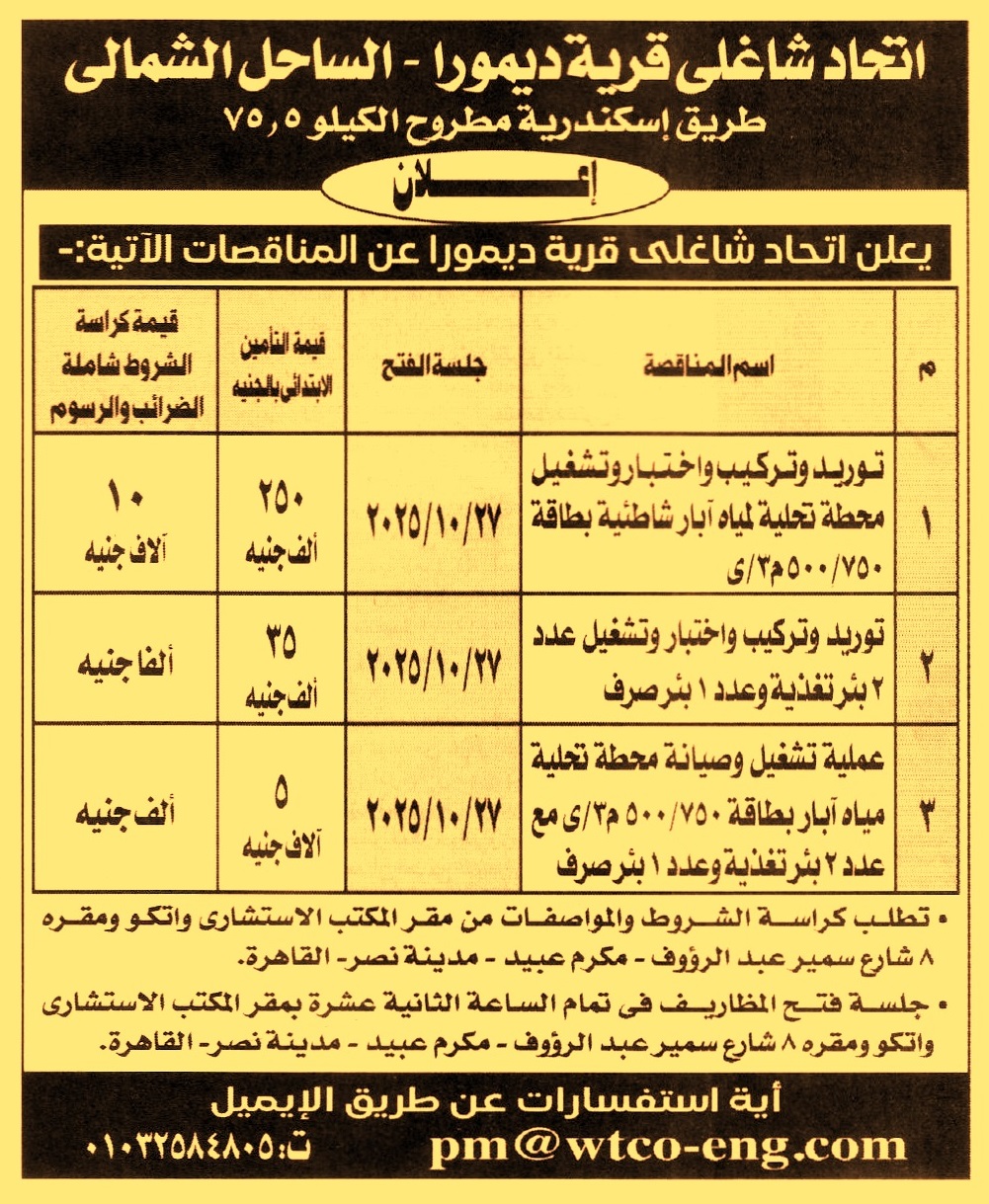 HOT Information مناقصة عامة لعملية توريد وتركيب واختبار وتشغيل محطة تحلية لمياه أبار شاطئية بطاقة 750, 500م3/يوم عن جريدة الأهرام Post navigation شركة مصر للطيران للخدمات الأرضية شركة كولدويل بانكر
