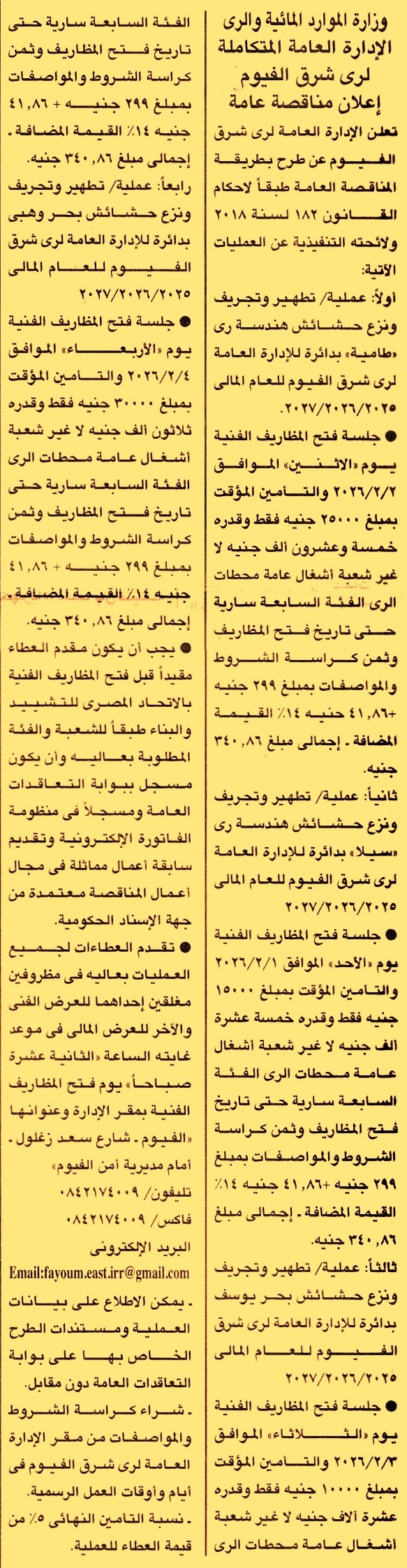 HOT Information مناقصة عامة لعملية تطهير وتجريف ونزع حشائش هندسة ري طامية للعام المالي 2025/2026/2027 (فئة التصنيف السابعة شعبة أعمال أشغال عامة ومحطات الري ويرفق مع المستندات سابقة أعمال) عن جريدة الجمهورية Post navigation محافظة الإسماعيلية مديرية الشباب والرياضة بالسويس