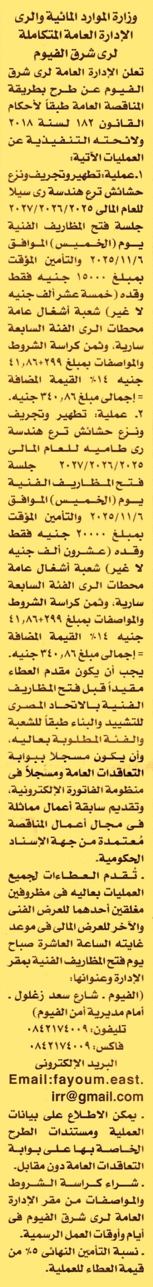 HOT Information مناقصة عامة لعملية تطهير وتجريف ونزع حشائش ترع هندسة ري سيلا للعام المالي 2025/2026/2027 (فئة التصنيف السابعة شعبة أعمال أشغال عامة ومحطات الري ويرفق مع المستندات سابقة أعمال) عن جريدة الأخبار Post navigation جهاز حماية وتنمية البحيرات والثروة السمكية محافظة كفر الشيخ