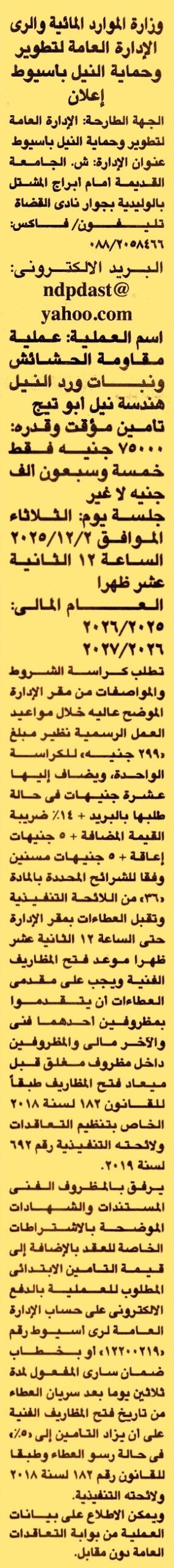 HOT Information مناقصة عامة لعملية مقاومة الحشائش ونبات ورد النيل بهندسة نيل أبو تيج للعام المالي 2025/2026/2027 (مدة سريان خطاب الضمان 30 يوم بعد سريان العطاءات) عن جريدة الجمهورية Post navigation جامعة بني سويف نادي جزيرة الورد الرياضي بالمنصورة