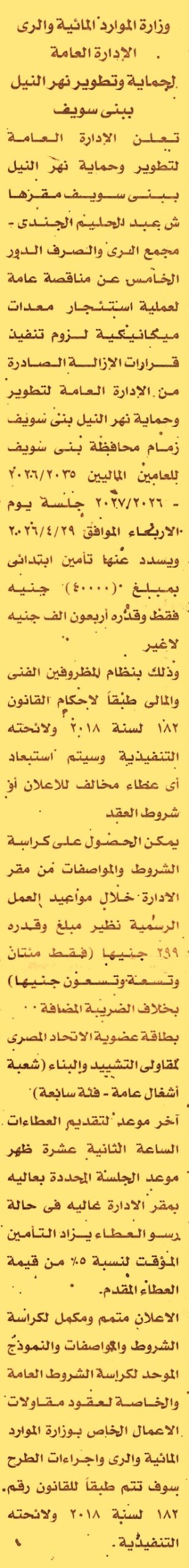 HOT information مناقصة عامة لعملية استئجار معدات ميكانيكية لزوم تنفيذ قرارات الإزالة الصادرة من الإدارة زمام محافظة بني سويف للعامين الماليين 2025/2026 – 2026/2027 (فئة التصنيف السابعة شعبة أشغال عامة) عن جريدة الأخبار Post navigation البنك العقاري المصري العربي شركة التعاون للبترول