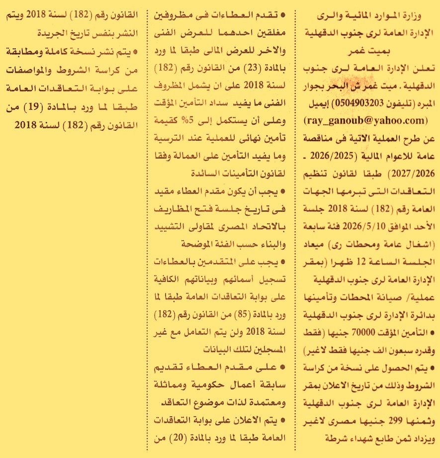 HOT information مناقصة عامة لعملية صيانة المحطات وتأمينها بدائرة الإدارة للأعوام المالية 2024/2025 – 2025/2026 – 2026/2027 (فئة التصنيف السابعة شعبة أشغال عامة ومحطات الري ويرفق مع المستندات سابقة أعمال حكومية) عن جريدة الأهرام Post navigation الجمعية التعاونية الزراعية بناحية العلامية ببيلا هيئة تنمية الصعيد