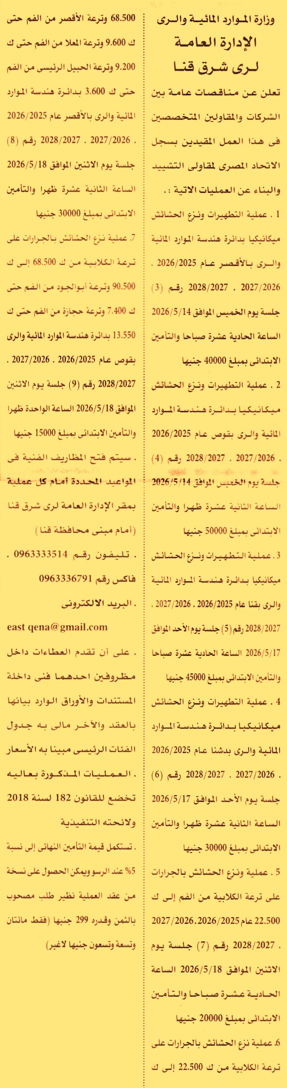 HOT Information مناقصة عامة رقم 3 لعملية التطهيرات ونزع الحشائش ميكانيكيا بدائرة هندسة الموارد المائية والري بالأقصر لعام 2025/2026 – 2026/2027 – 2027/2028 عن جريدة الأهرام Post navigation مديرية الشئون الصحية بالشرقية المؤسسة الاستشارية للشباب والتنمية