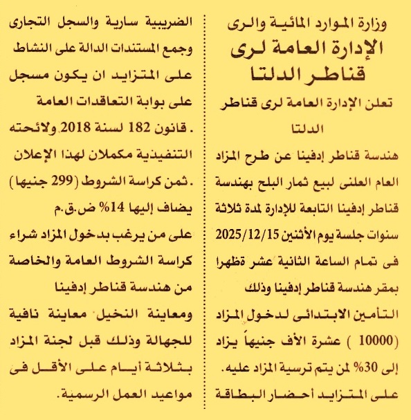 HOT Information مزايدة علنية عامة لعملية بيع ثمار البلح بهندسة قناطر إدفينا التابعة للإدارة لمدة 3 سنوات عن جريدة الأهرام Post navigation شركة ميناء القاهرة الجوي وزارة الصحة والسكان