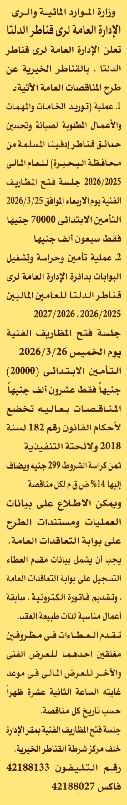 HOT information مناقصة عامة لعملية توريد الخامات والمهمات والأعمال المطلوبة لصيانة وتحسين حدائق قناطر إدفينا المسلمة من محافظة البحيرة (يرفق مع المستندات سابقة أعمال) عن جريدة الأهرام Post navigation جامعة المنصورة جامعة الدلتا التكنولوجية