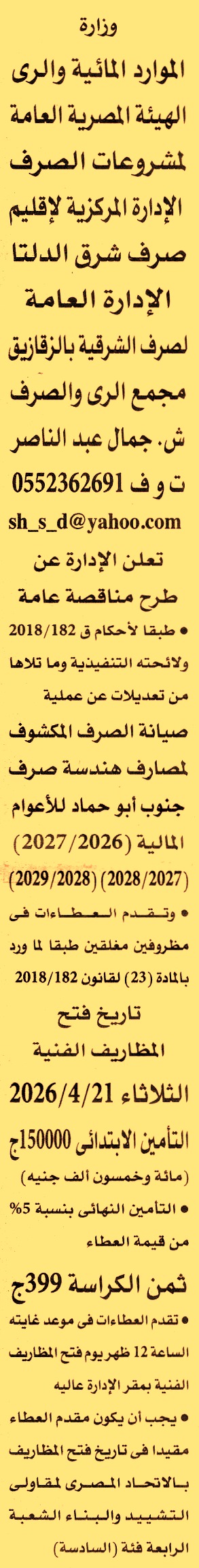 HOT Information مناقصة عامة لعملية صيانة الصرف المكشوف لمصارف هندسة صرف جنوب أبو حماد للأعوام المالية 2026/2027 – 2027/2028 – 2028/2029 (فئة التصنيف السادسة الشعبة الرابعة) عن جريدة الأهرام Post navigation شركة مياه الشرب والصرف الصحي بالبحيرة شركة مياه الشرب والصرف الصحي بمحافظات القناة