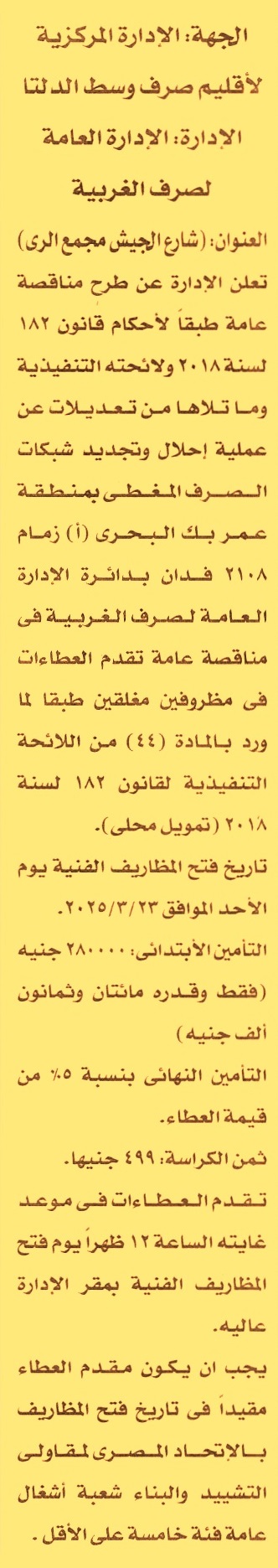 HOT Information مناقصة عامة لعملية إحلال وتجديد شبكات الصرف المغطى بمنطقة عمر بك البحري “أ” زمام 2108 فدان بدائرة الإدارة العامة لصرف الغربية (فئة التصنيف الخامسة شعبة أشغال عامة) عن جريدة الجمهورية Post navigation البنك الزراعي المصري شركة مطاحن ومخابز الإسكندرية