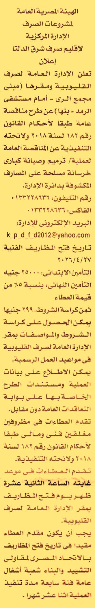 HOT Information مناقصة عامة لعملية ترميم وصيانة كباري خرسانة مسلحة على المصارف المكشوفة بدائرة الإدارة مدة تنفيذ العملية 12 شهر (فئة التصنيف السابعة شعبة أشغال عامة) عن جريدة الأخبار Post navigation جامعة طنطا جهاز تنمية مدينة طيبة الجديدة