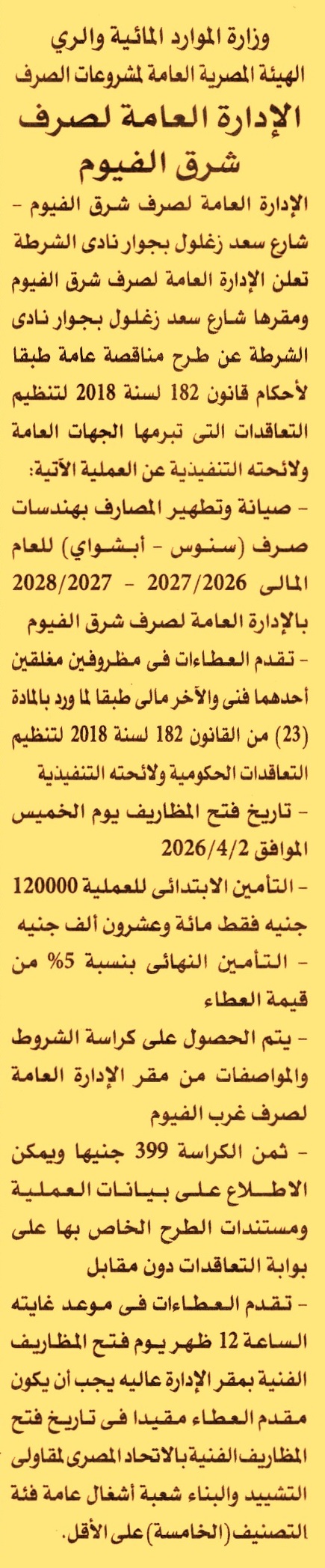 HOT information مناقصة عامة لعملية صيانة وتطهير المصارف بهندسات صرف “سنوس – أبشواي” للعام المالي 2026/2027 – 2027/2028 (فئة التصنيف الخامسة شعبة أشغال عامة) عن جريدة الأهرام Post navigation جامعة بني سويف الأهلية الجمعية التعاونية العامة للإصلاح الزراعي