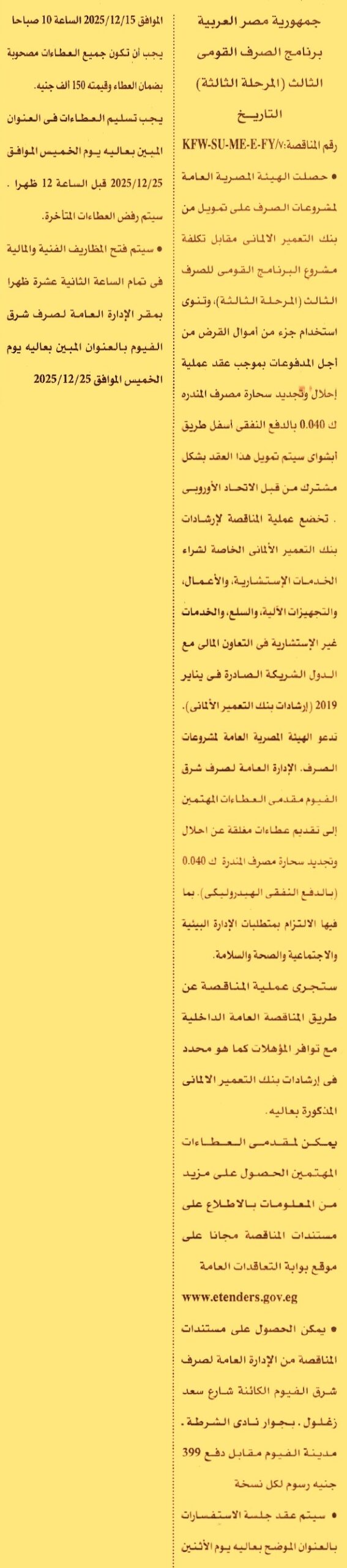 (تعقد جلسة الإستفسارات يوم الأربعاء 15/12/2025 الساعة 10 ص ومدة سريان العطاءات 4 أشهر)