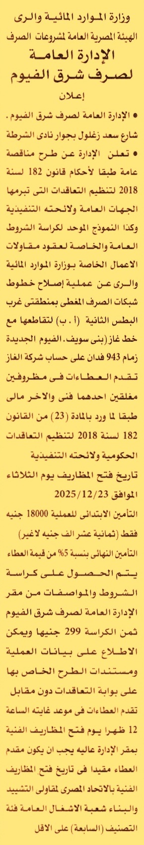 HOT Information مناقصة عامة لعملية إصلاح خطوط شبكات الصرف المغطى بمنطقتي البطس الثانية “أ, ب” لتقاطعها مع خط غاز “بني سويف, الفيوم الجديدة” زمام 943 فدان (فئة التصنيف السابعة شعبة أشغال عامة) عن جريدة الأهرام Post navigation مستشفيات جامعة المنصورة شركة قنا لصناعة الورق
