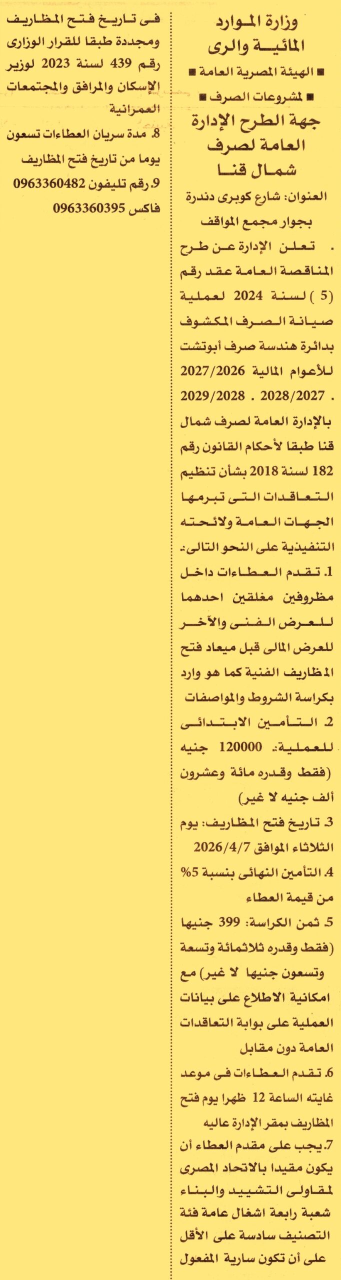 HOT Information مناقصة عامة رقم 5/2025/2026 لعملية صيانة الصرف المكشوف بدائرة هندسة صرف أبو تشت للأعوام المالية 2026/2027, 2027/2028, 2028/2029 (مدة سريان العطاءات 3 أشهر وفئة التصنيف السادسة شعبة أشغال عامة) عن جريدة الأهرام Post navigation شركة مصر للبترول مركز التنمية الشبابية بمدينة دمياط الجديدة