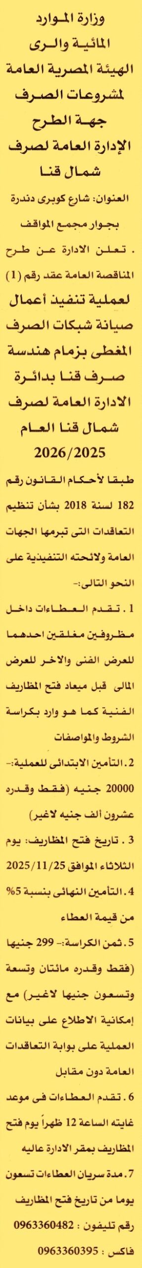HOT Information مناقصة عامة رقم 1/2025/2026 لعملية صيانة شبكات الصرف المغطى بزمام هندسة صرف قنا (مدة سريان العطاءات 3 أشهر) عن جريدة الأهرام Post navigation الهيئة القومية لسكك حديد مصر شركة النصر للتعدين
