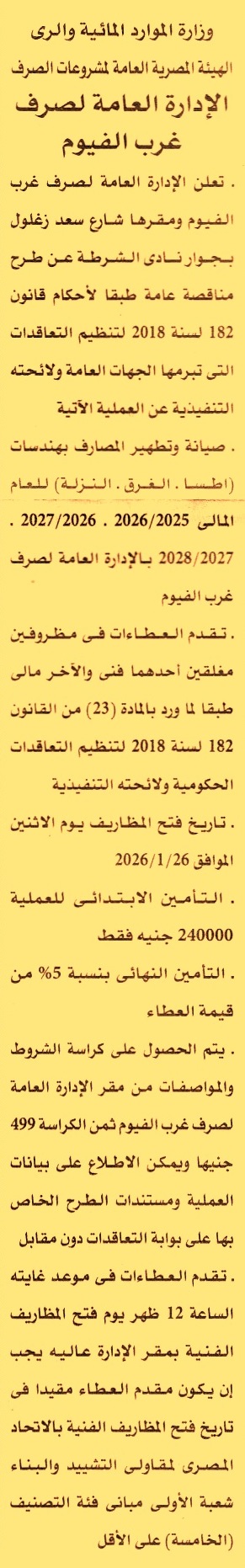 HOT Information مناقصة عامة لعملية صيانة وتطهير المصارف بهندسات “اطسا, الغرق, النزلة” للعام المالي 2025/2026 – 2026/2027 – 2027/2028 (فئة التصنيف الخامسة شعبة أعمال مباني) عن جريدة الأهرام Post navigation الإدارة العامة لصرف شمال المنيا مركز شباب باب العلم بالعدوة