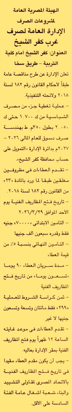 HOT Information مناقصة عامة لعملية تغطية جزء من مصرف الشباسية من ك 1.700 حتى ك 2.050 بطول 350م بهندسة صرف دسوق للعام المالي 2026/2027 (فئة التصنيف السادسة شعبة أشغال عامة ومدة سريان العطاءات 3 أشهر) عن جريدة الجمهورية Post navigation جامعة قنا شركة مطاحن شرق الدلتا