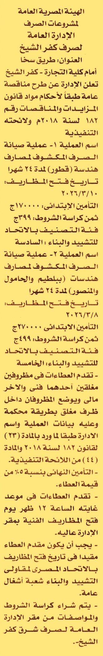 HOT Information مناقصة عامة لعملية صيانة الصرف المكشوف لمصارف هندسة قطور لمدة 24 شهر (فئة التصنيف السادسة شعبة أشغال عامة) عن جريدة الأخبار Post navigation الجمعية الشرعية لتعاون العاملين بالكتاب والسنة المحمدية بفرشوط جامعة بنها