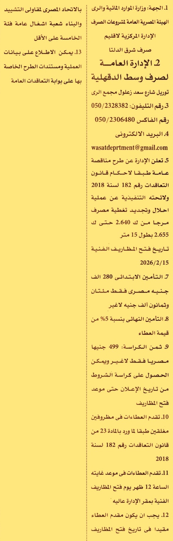 HOT Information مناقصة عامة لعملية إحلال وتجديد تغطية مصرف مرجا من ك 2.640 حتى ك 2.655 بطول 15م (فئة التصنيف الخامسة شعبة أشغال عامة) عن جريدة الأهرام Post navigation مؤسسة مستشفى أورام الأطفال 57357 جامعة القاهرة