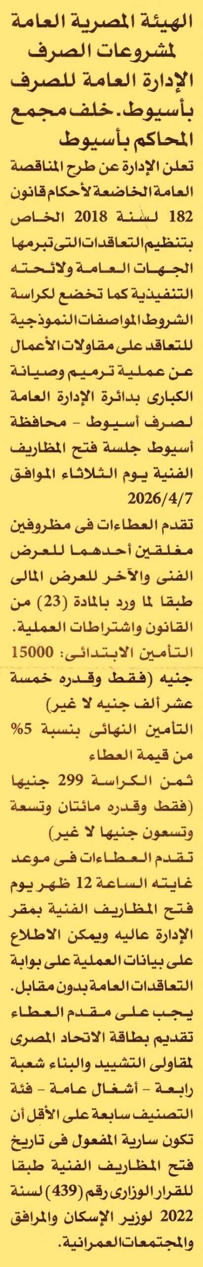 HOT Information مناقصة عامة لعملية ترميم وصيانة الكباري بدائرة الإدارة العامة لصرف أسيوط (فئة التصنيف السابعة شعبة أشغال عامة) عن جريدة الأهرام Post navigation شركة سيناء للمنجنيز شركة مياه الشرب والصرف الصحي بسوهاج