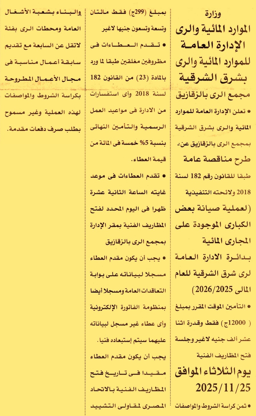 HOT Information مناقصة عامة لعملية صيانة بعض الكباري الموجودة على المجاري المائية للعام المالي 2024/2025 – 2025/2026 (فئة التصنيف السابعة شعبة أشغال عامة ومحطات الري ويرفق مع المستندات سابقة أعمال مشابهة) عن جريدة الأهرام Post navigation شركة السويس لتصنيع البترول المعهد القومي للتغذية