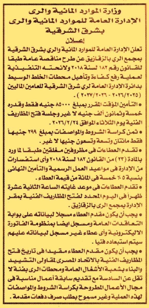 HOT Information مناقصة عامة لعملية رفع كفاءة وتأهيل محطات الخلط الوسيط بدائرة الإدارة للعام المالي 2025/2026/2027 (فئة التصنيف السادسة شعبة أشغال عامة ومحطات الري ويرفق مع المستندات سابقة أعمال) عن جريدة الجمهورية Post navigation الجمعية المشتركة للإصلاح الزراعي بدكرنس مركز شباب قطيفة العزيزية