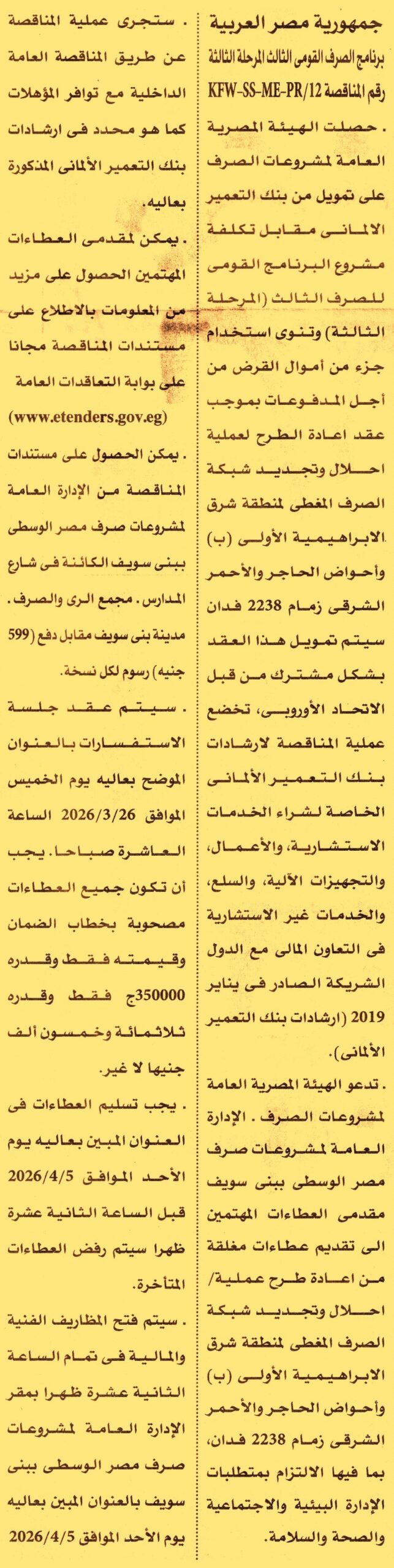 (تعقد جلسة الإستفسارات يوم 26/3/2026 الساعة 10 ص ومدة سريان العطاءات 4 أشهر)