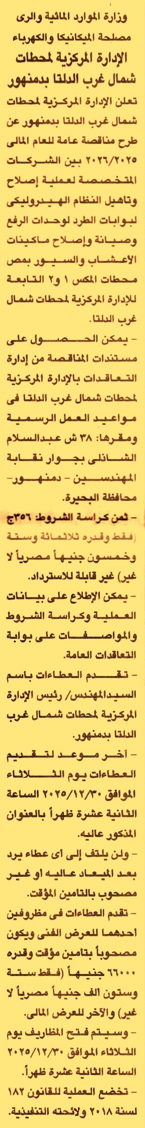HOT Information مناقصة عامة لعملية إصلاح وتأهيل النظام الهيدروليكي لبوابات الطرد لوحدات الرفع وصيانة وإصلاح ماكينات الأعشاب والسيور بمص محطات المكس 1 و2 عن جريدة الجمهورية Post navigation المستشفى الجامعي بالإسماعيلية الوحدة المحلية لمدينة إدفو