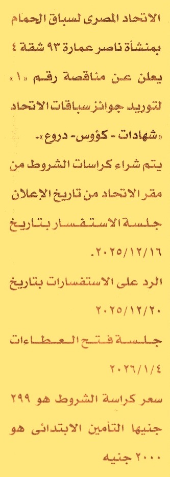HOT information مناقصة عامة رقم 1 لعملية توريد جوائز سباقات الاتحاد “شهادات, كؤوس, دروع” (جلسة الاستفسارات يوم 16/12/2025 وجلسة الرد على الاستفسارات يوم 20/12/2025) عن جريدة الأخبار Post navigation الهيئة القومية لسكك حديد مصر مركز شباب شعشاع بالمنوفية