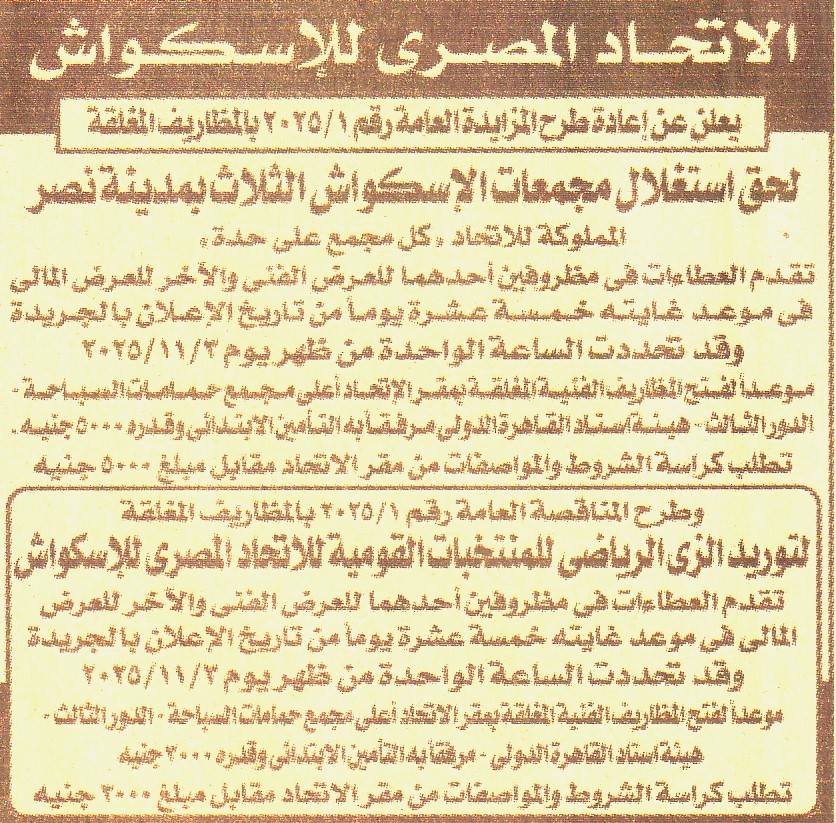 HOT information مناقصة عامة رقم 1 لعملية توريد الزي الرياضي للمنتخبات القومية للإتحاد المصري للاسكواش عن جريدة الجمهورية Post navigation مديرية الشباب والرياضة بالمنوفية مجمع اللغة العربية
