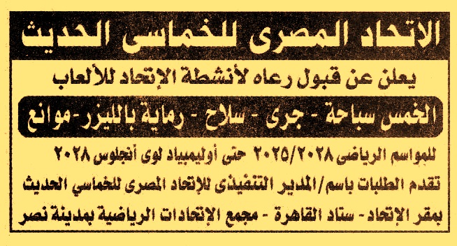 HOT Information مزايدة عامة لعملية رعاية أنشطة الإتحاد للألعاب “الخمس سباحة, جري, سلاح, رماية بالليزر, موانع” للموسم الرياضي 2025/2028 حتى أولمبياد لوس انجلوس 2028 عن جريدة الجمهورية Post navigation شركة البتروكيماويات المصرية