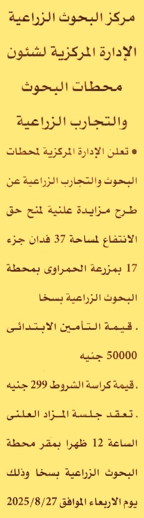HOT Information مزايدة علنية لعملية حق الانتفاع لمساحة 37 فدان جزء 17 بمزرعة الحمراوي بمحطة البحوث الزراعية بسخا عن جريدة الأهرام Post navigation جمعية التضامن الإسلامي مؤسسة مستشفى أورام الأطفال 57357