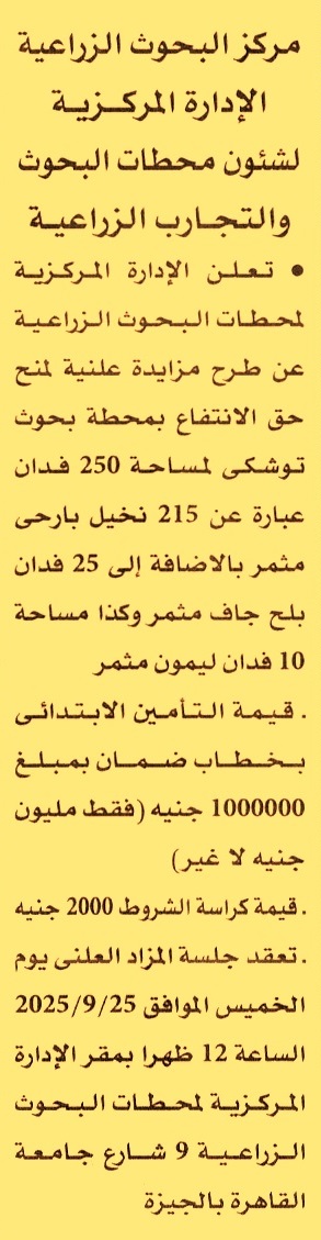 HOT Information مزايدة علنية لعملية حق الانتفاع لمساحة 250 فدان عبارة عن 215 نخيل بارحي مثمر بالإضافة إلى 25 فدان بلح جاف مثمر وكذا مساحة 10 فدان ليمون مثمر بمحطة بحوث توشكى عن جريدة الأهرام Post navigation محافظة دمياط جامعة القاهرة