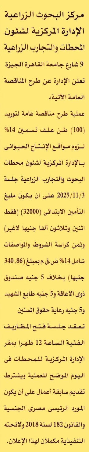 HOT Information مناقصة عامة لعملية توريد 100 طن علف تسمين 14% لزوم مواقع الإنتاج الحيواني بالإدارة (يرفق مع المستندات سابقة أعمال) عن جريدة الأهرام Post navigation محافظة الغربية مؤسسة ساويرس للتنمية الاجتماعية