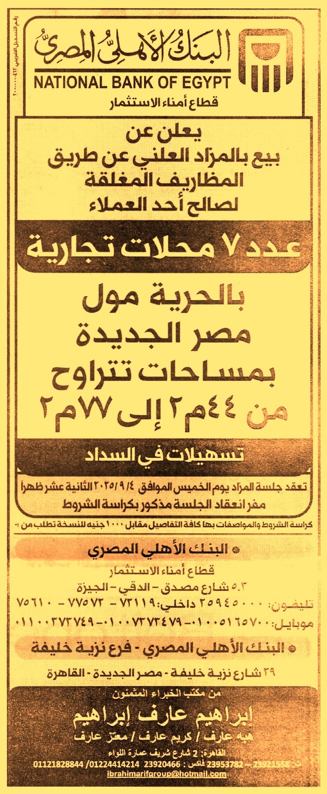 HOT information مزايدة علنية لعملية بيع عدد 7 محلات تجارية بمساحات تتراوح من 44م2 إلى 77م2 بالحرية مول – مصر الجديدة (تسهيلات في السداد) عن جريدة الأهرام Post navigation شركة مصر للطيران للخدمات الأرضية بنك مصر