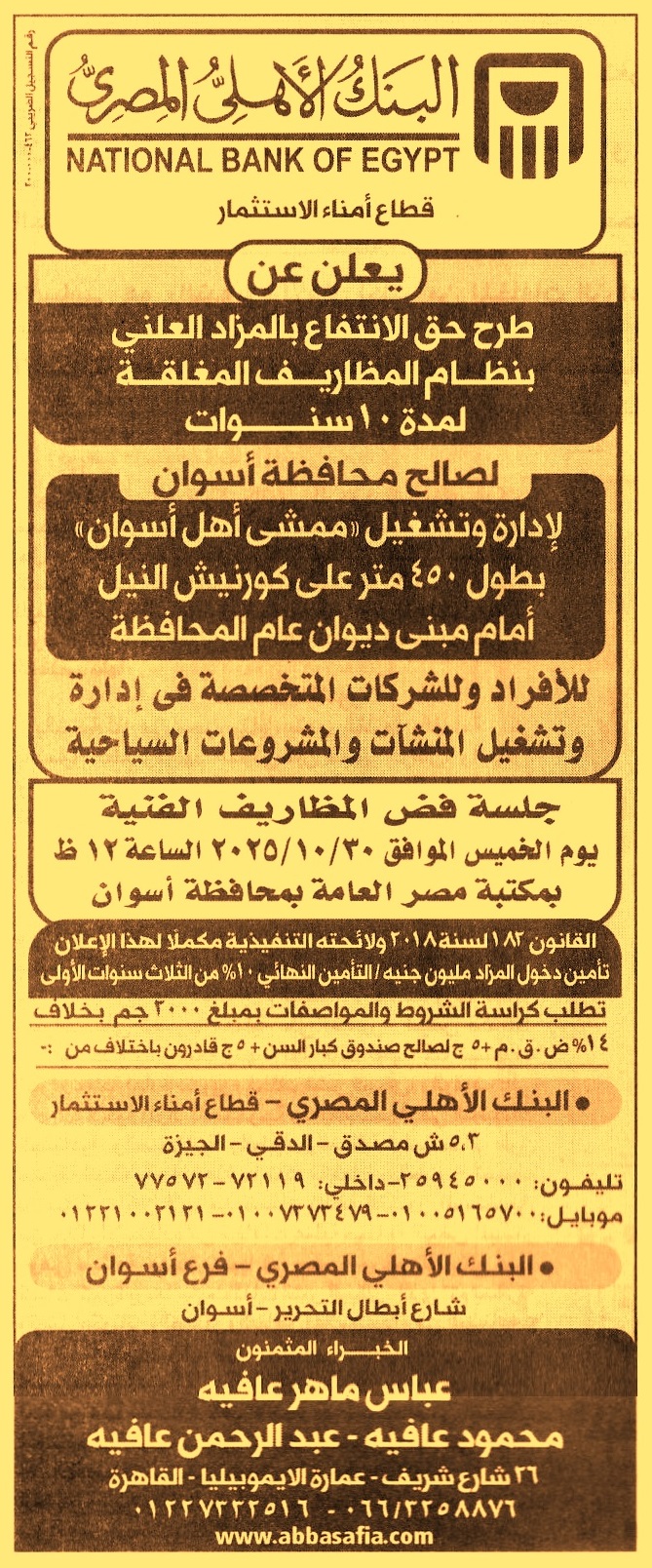 HOT Information مزايدة علنية لعملية إدارة وتشغيل ممشى أهل أسوان بطول 450م على كورنيش النيل أمام مبنى ديوان عام المحافظة بنظام حق الإنتفاع لمدة 10 سنوات (تسهيلات في السداد) عن جريدة الأهرام Post navigation البنك الزراعي المصري شركة مصر للطيران للخدمات الأرضية
