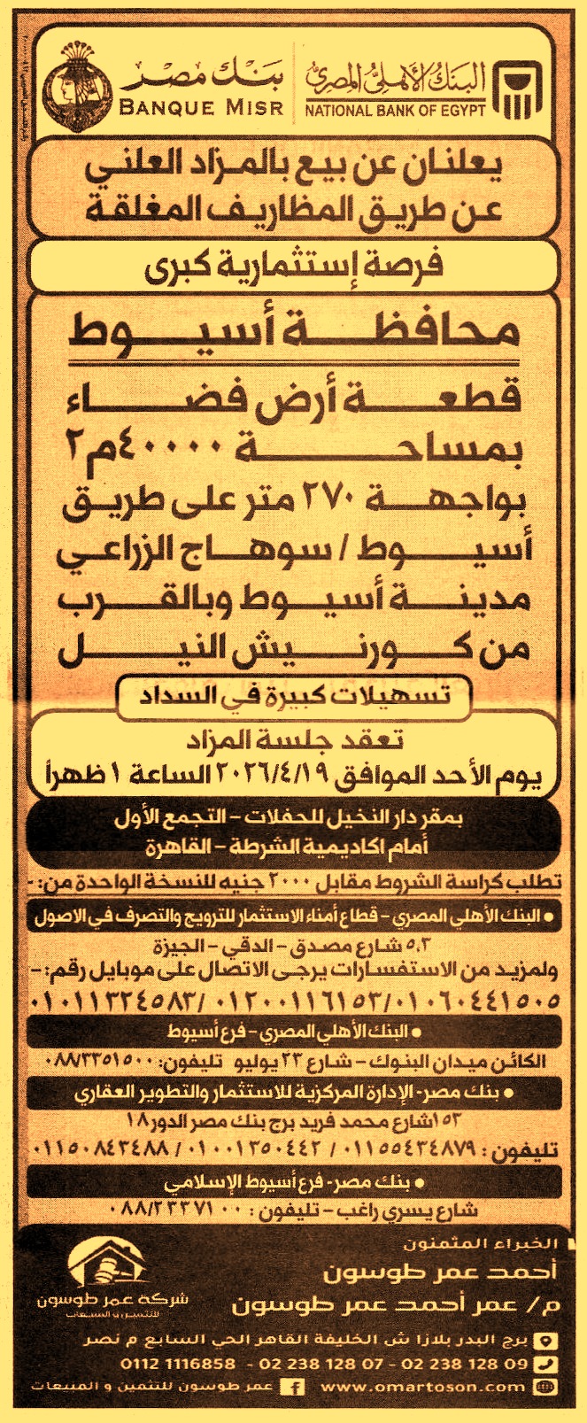 بواجهة 270م على طريق أسيوط/ سوهاج الزراعي بمدينة أسيوط