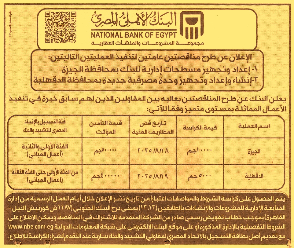 HOT Information مناقصة عامة لعملية إعداد وتجهيز مسطحات إدارية للبنك بمحافظة الجيزة (فئة التصنيف الأولي والثانية شعبة أعمال مباني ويرفق مع المستندات أصل بطاقة التسجيل بالاتحاد المصري لمقاولي التشييد والبناء) عن جريدة الأخبار Post navigation شركة الاسكندرية للمجمعات الاستهلاكية الوحدة المحلية لمركز ومدينة أهناسيا