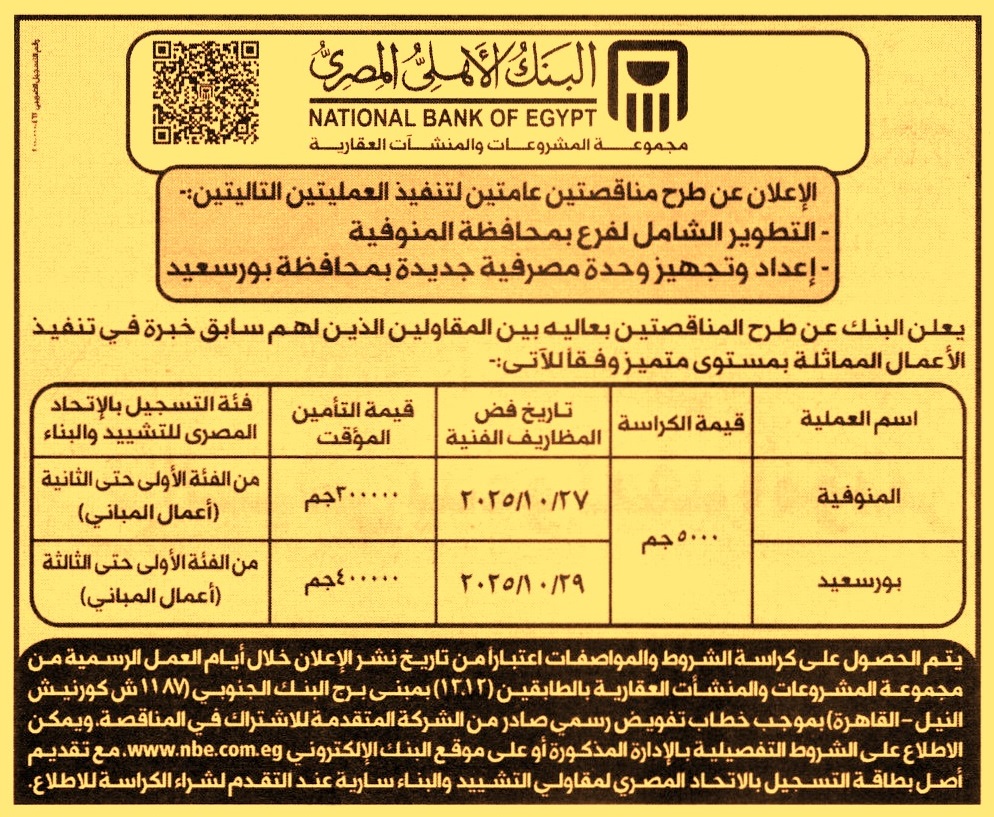 HOT information مناقصة عامة لعملية تنفيذ أعمال التطوير لفرع بمحافظة المنوفية (فئة التصنيف من الأولي حتى الثانية شعبة أعمال مباني ويرفق مع المستندات أصل بطاقة التسجيل بالاتحاد المصري لمقاولي التشييد والبناء) عن جريدة الأهرام Post navigation شركة ميناء القاهرة الجوي الجمعية التعاونية العامة للإصلاح الزراعي