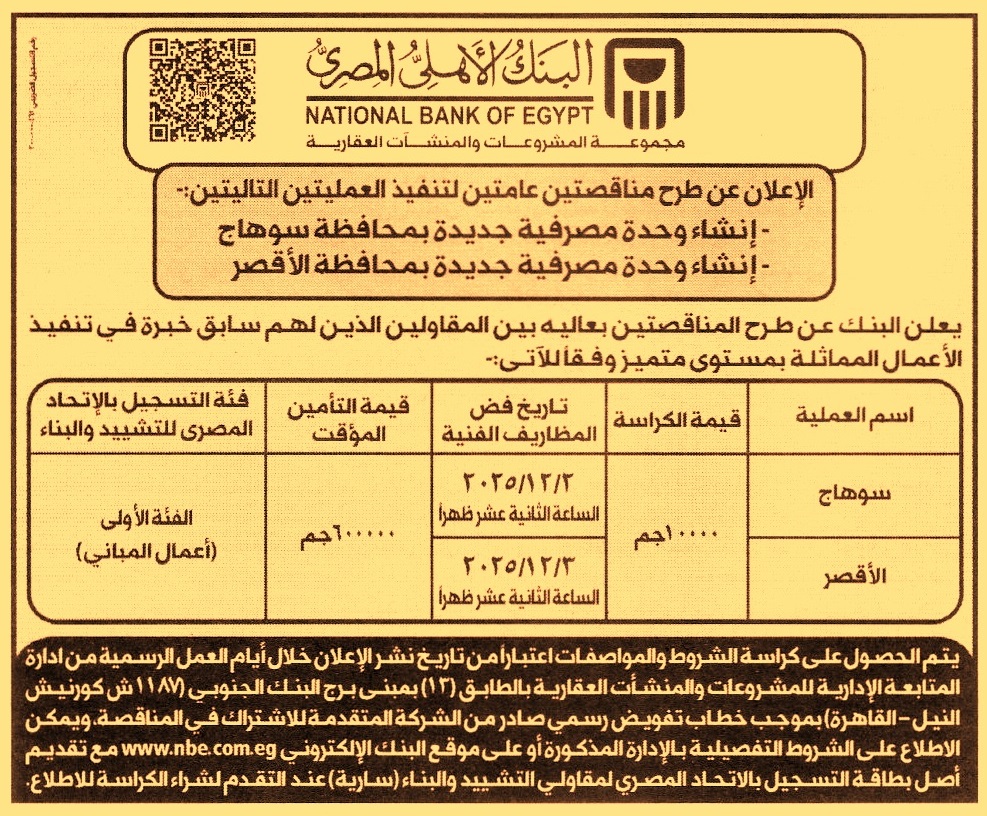 HOT Information مناقصة عامة لعملية إنشاء وحدة مصرفية جديد بمحافظة سوهاج (فئة التصنيف من الأولي شعبة أعمال مباني ويرفق مع المستندات أصل بطاقة التسجيل بالاتحاد المصري لمقاولي التشييد والبناء) عن جريدة الأهرام Post navigation وزارة التربية والتعليم والتعليم الفني مؤسسة شفاء الأورمان