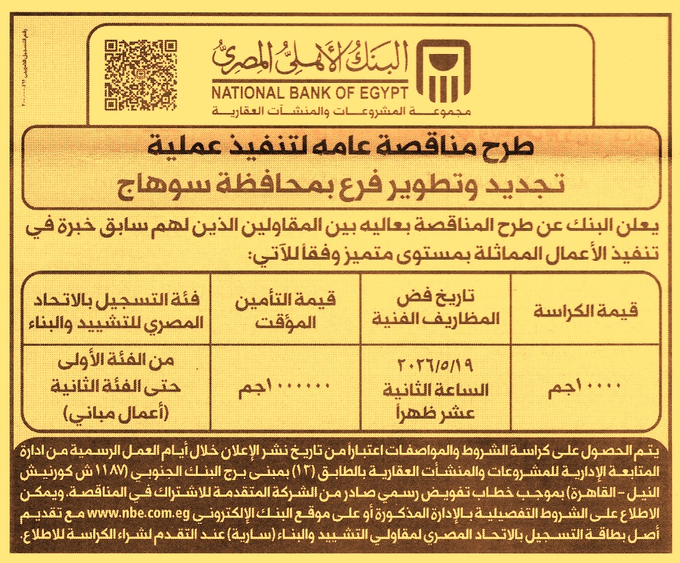 HOT Information مناقصة عامة لعملية تجديد وتطوير فرع بمحافظة سوهاج (فئة التصنيف الأولي والثانية شعبة أعمال مباني ويرفق مع المستندات أصل بطاقة التسجيل بالاتحاد المصري لمقاولي التشييد والبناء) عن جريدة الأهرام Post navigation البنك الزراعي المصري نادي الواسطى