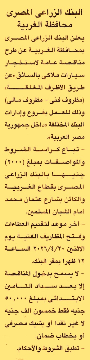HOT information مناقصة عامة لعملية استئجار سيارات ملاكي بالسائق للعمل بفروع وإدارات البنك المختلفة عن جريدة الأخبار Post navigation مركز شباب توشكى مستشفى جامعة الأزهر بدمياط الجديدة
