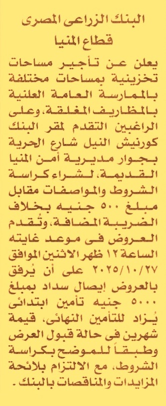 HOT information ممارسة علنية عامة لعملية تأجير مساحات تخزينية بمساحات مختلفة عن جريدة الأخبار Post navigation الوحدة المحلية لمركز ومدينة كفر الدوار حي غرب مدينة نصر