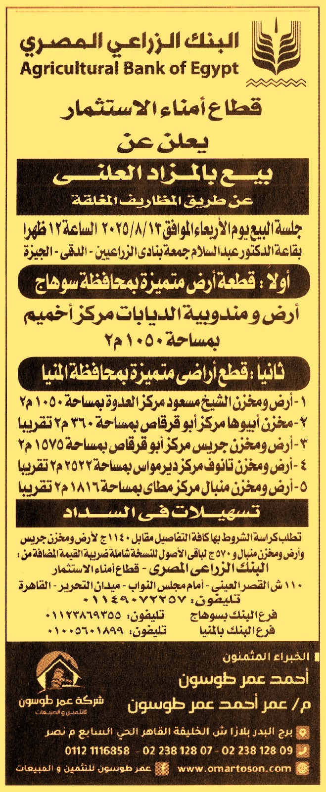 ثانيا: قطع أراضي متميزة بمحافظة المنيا