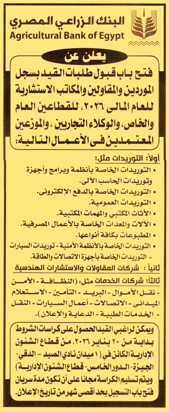 (تباع الكراسة من يوم 20/1/2026 وتقدم طلبات القيد لمدة شهر من تاريخ الإعلان)
