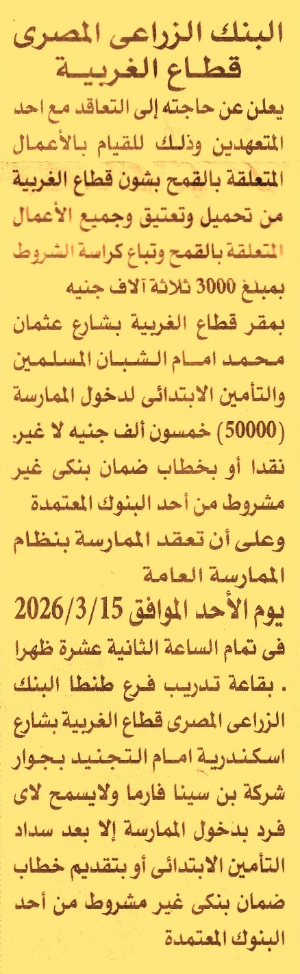 HOT information ممارسة عامة لعملية التعاقد على تنفيذ الأعمال المتعلقة بالقمح بشون قطاع الغربية من تحميل وتعتيق وجميع الأعمال المتعلقة بالقمح عن جريدة الأهرام Post navigation شركة مياه الشرب والصرف الصحي بسوهاج مجلس مدينة شرم الشيخ