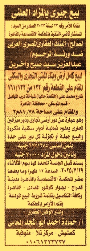 بيع كامل أرض وبناء المبنى التجاري والسكني المقام على قطعة رقم 132 من 132/161