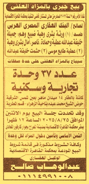HOT Information مزايدة علنية لعملية بيع عدد 37 وحدة تجارية وسكنية كائنة بالعقار 14 ميدان ماهر – عين شمس الشرقية حوض الشيخ محمد عبده – ناحية الزهراء – قسم المطرية عن جريدة الأخبار Post navigation شركة أل عزت للخبرة والتثمين الشركة المصرية لمدينة الإنتاج الإعلامي